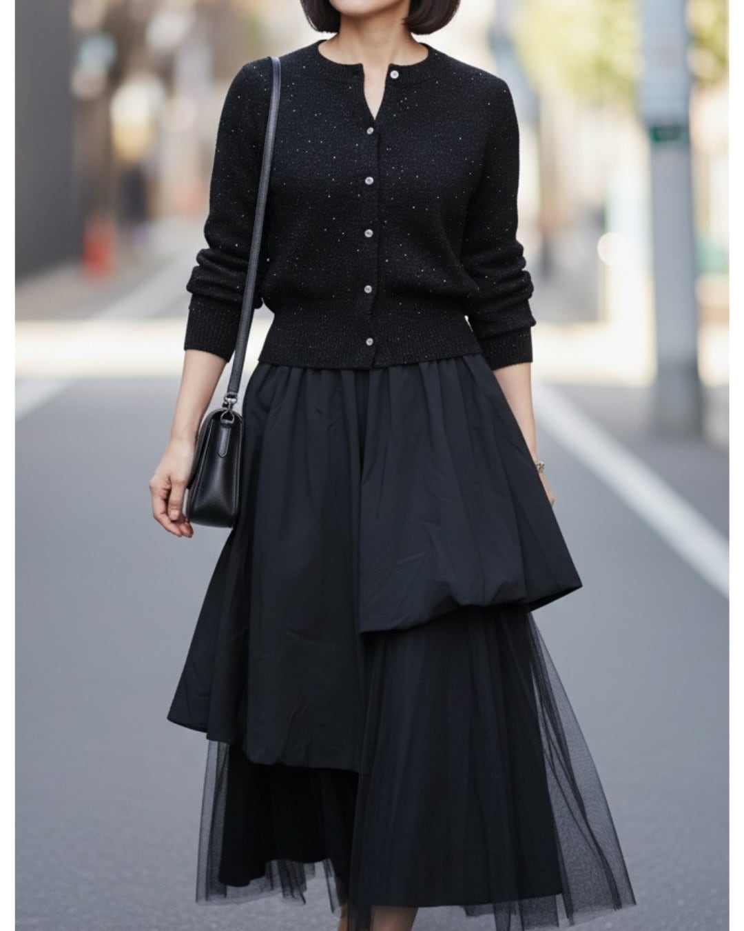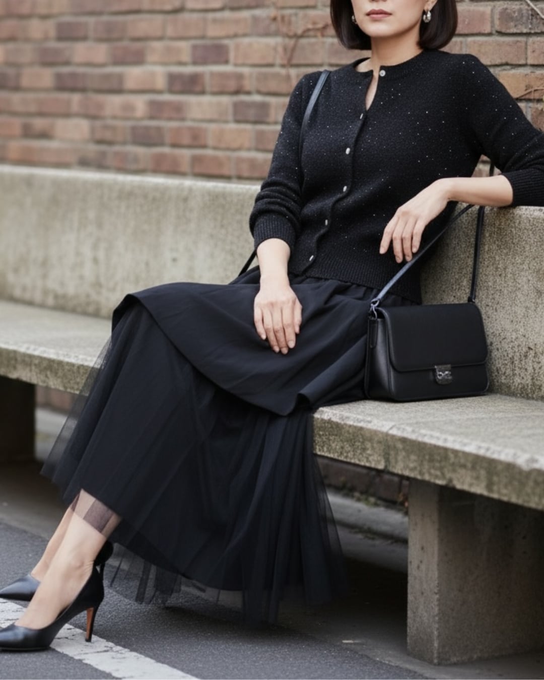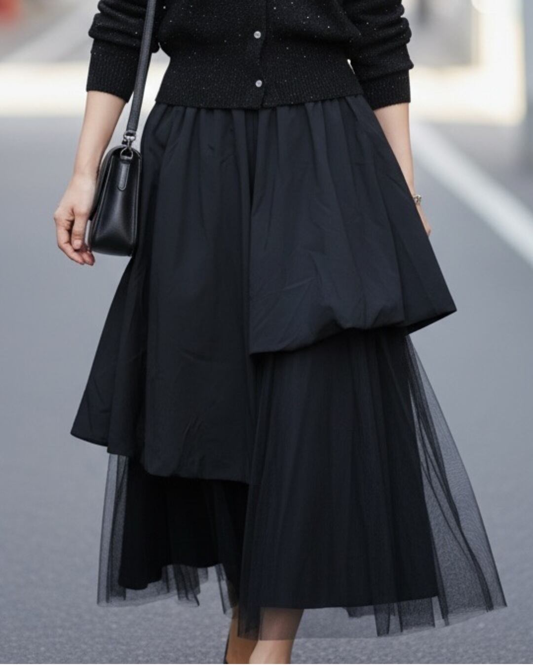 軽やかなチュールを重ねたスカートは、歩くたびにふんわり揺れて女性らしさを引き立てます。