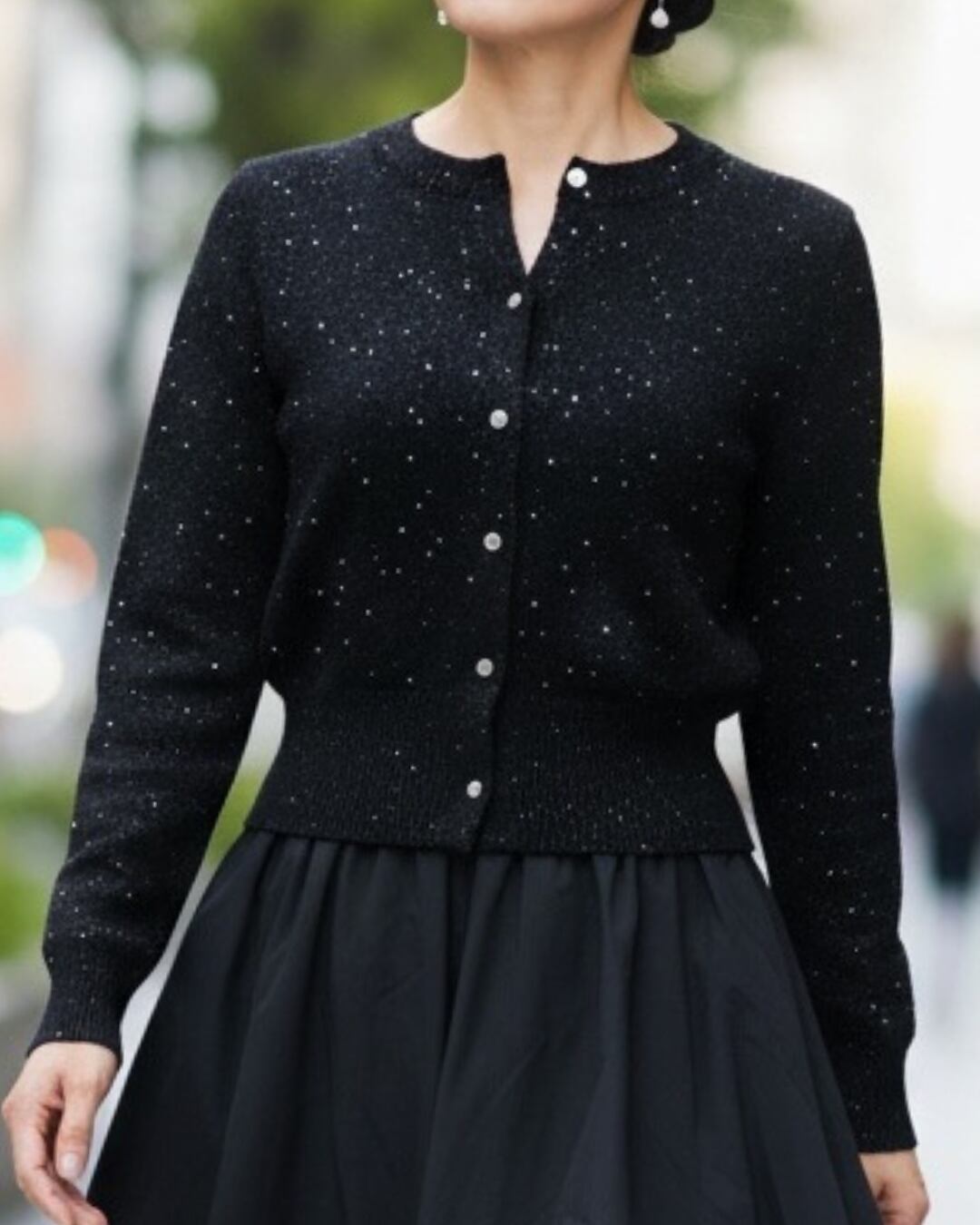 さりげなくきらめくラメ入りニットカーディガンは、コンパクトなシルエットでスタイルアップ効果◎