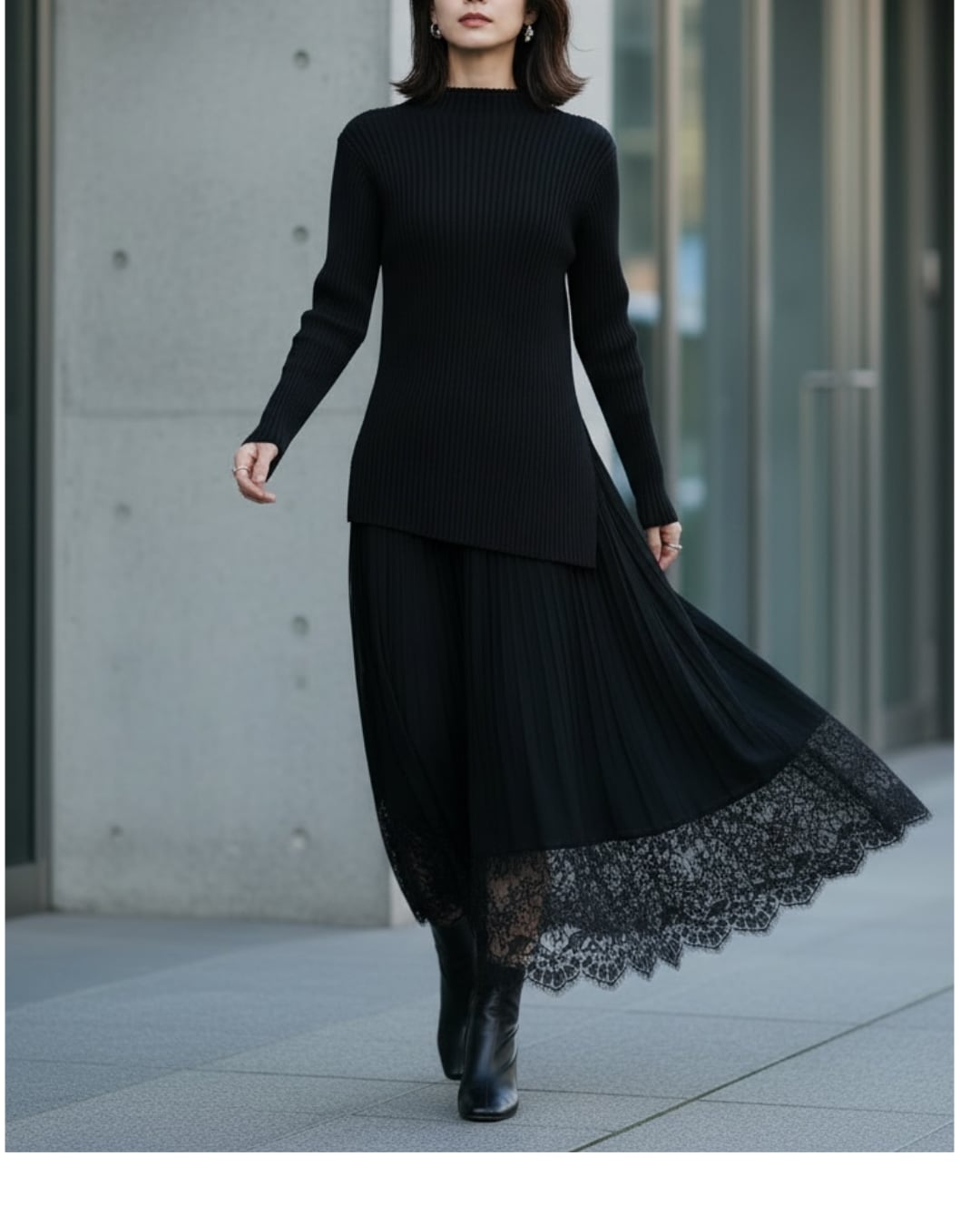 上品さと女性らしさを兼ね備えた、大人のためのブラックセットアップ。